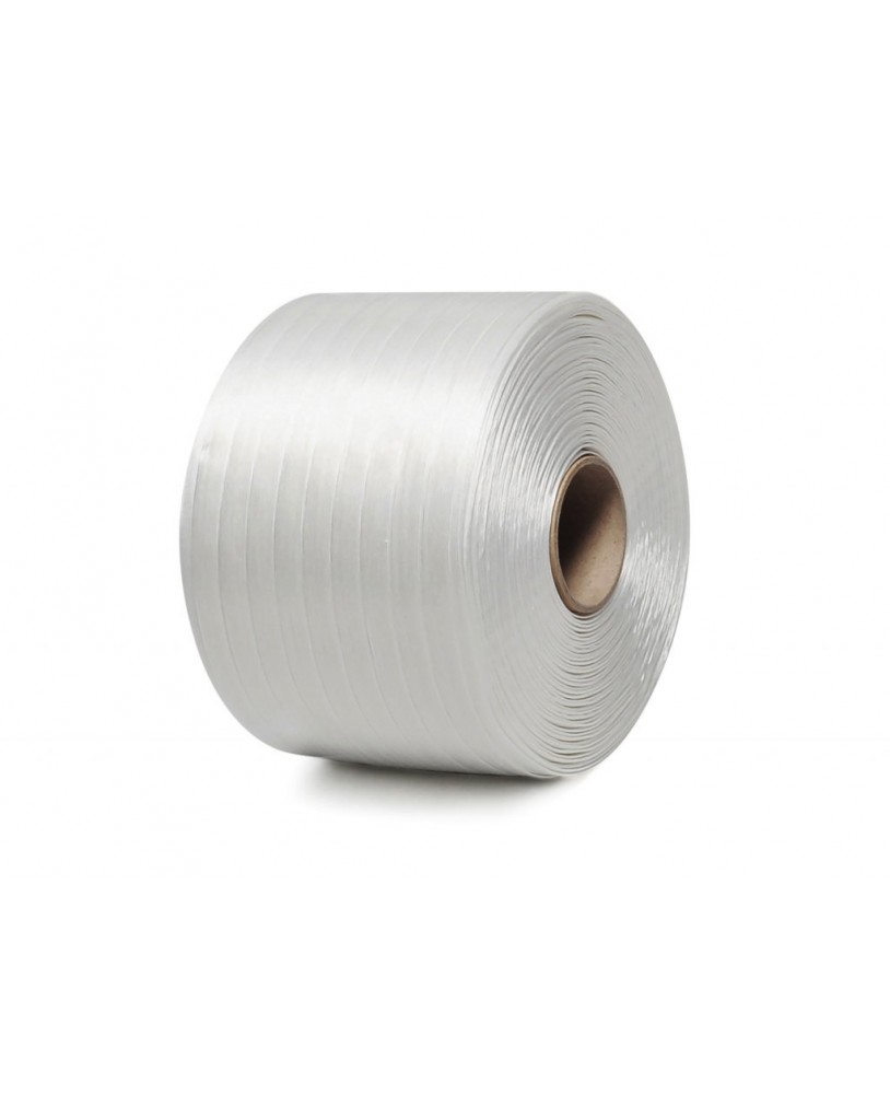 White woven cord strap width 25mm and lenght 500m. This light, UV resistant, user friendly textile polyester strapping is used for strapping and stabilizating products on pallets and preparing them for transport. Due to high elongation (13%) this strap has very high breaking strenght and can replace even steel strap. Specially used in wood industry in drying chambers.